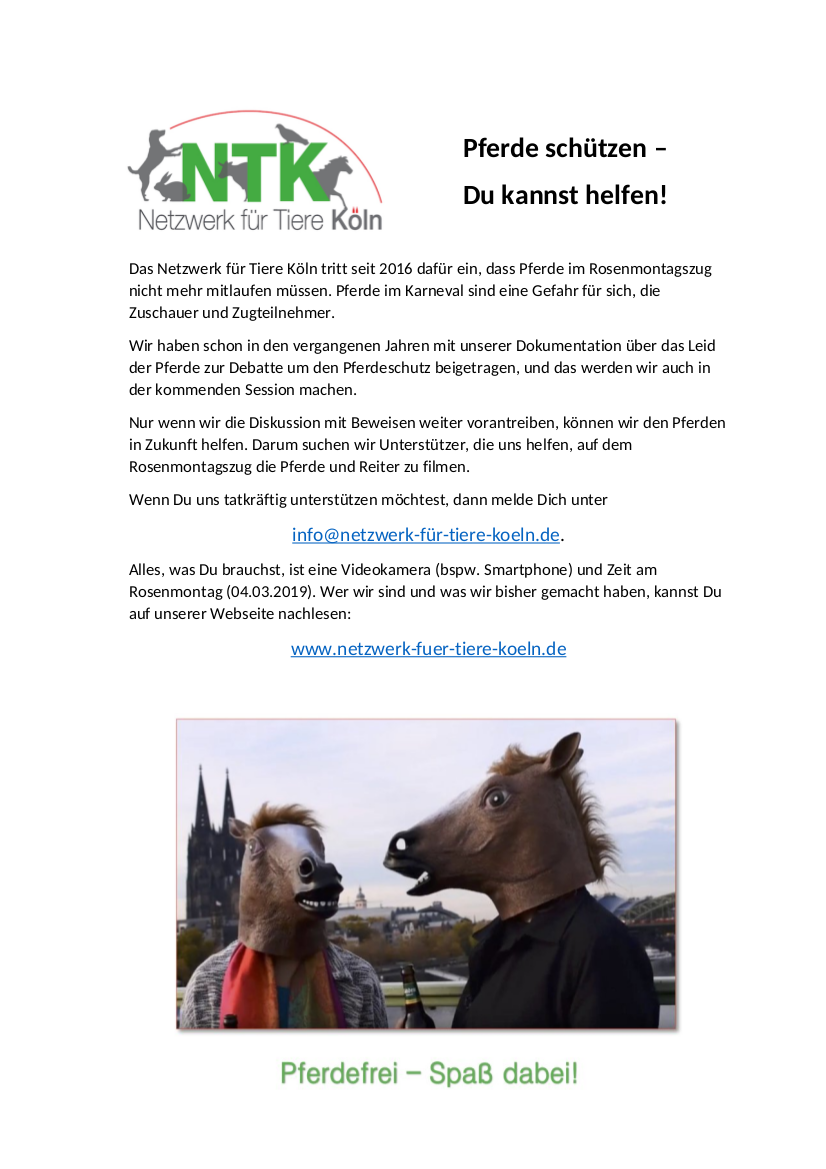 auch in dieser Session wollen wir für das Verbot von Pferden im Karneval kämpfen – und dazu brauchen wir diesmal eure tatkräftige Unterstützung!